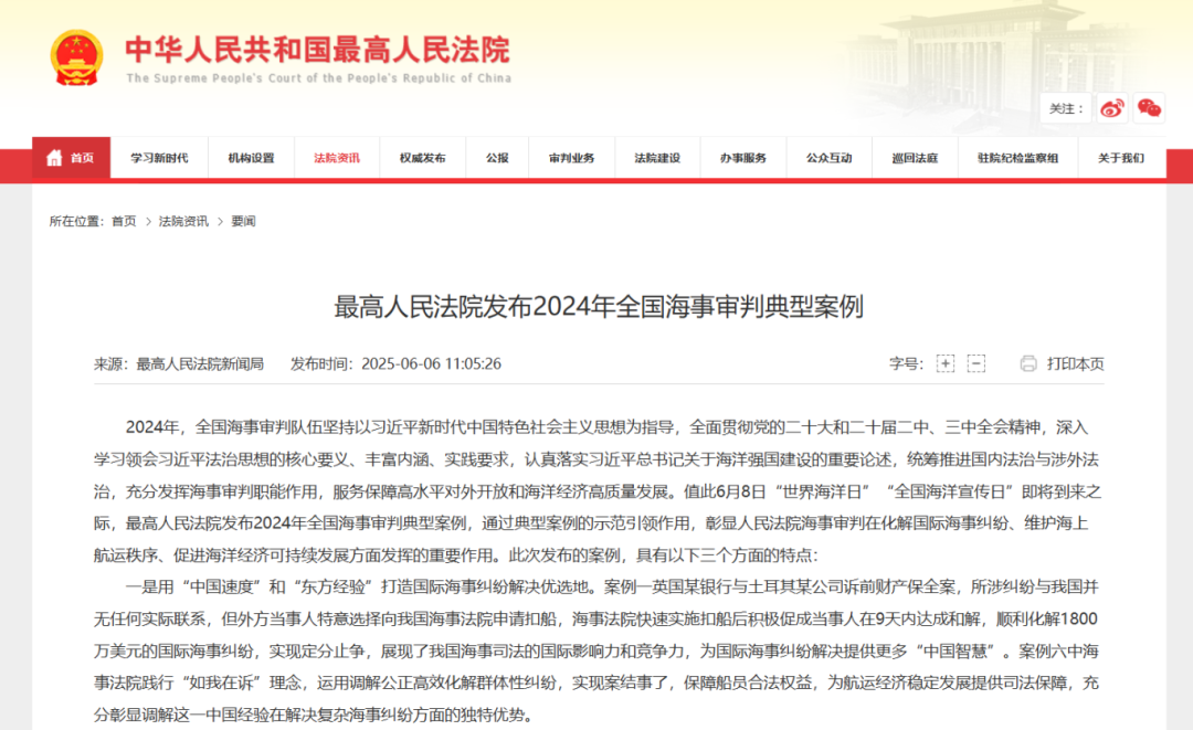 2025年6月6日,最高人民法院发布2024年全国海事审判典型案例。