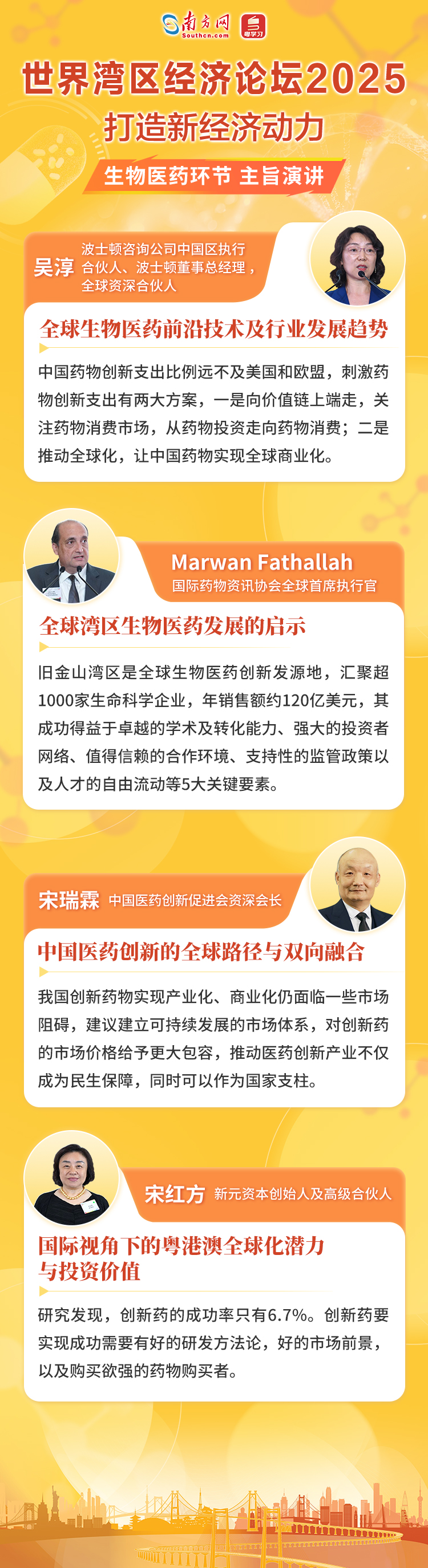 11月3日下午,构建世界湾区经济论坛2025生物医药分论坛在香港召开。生物生态论坛上全球专家学者、医药跃升业界代表畅所欲言,创新产业为大湾区生物医药创新生态的推动构建提供路径参考。他们具体说了哪些核心观点?湾区以下海报带你读懂↓